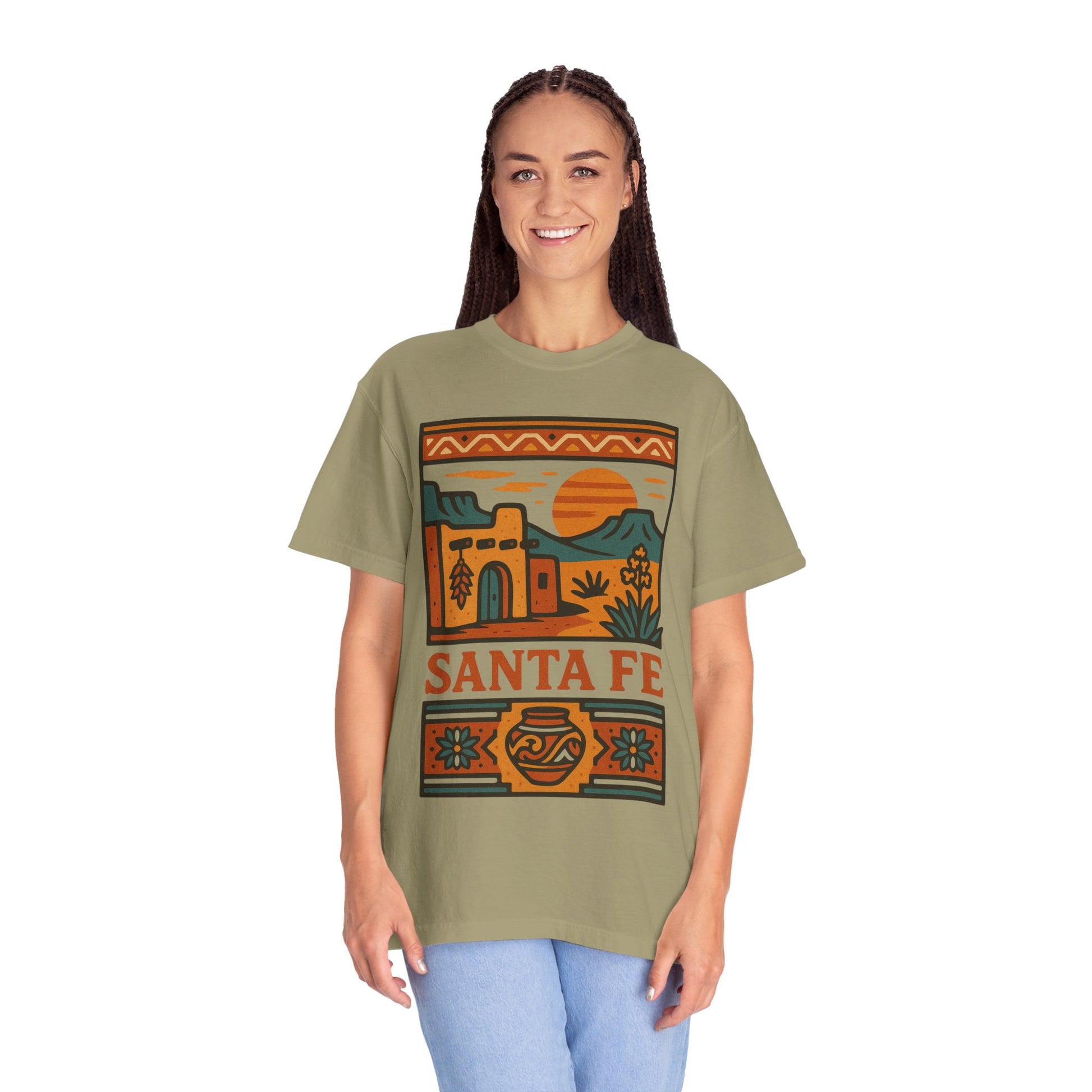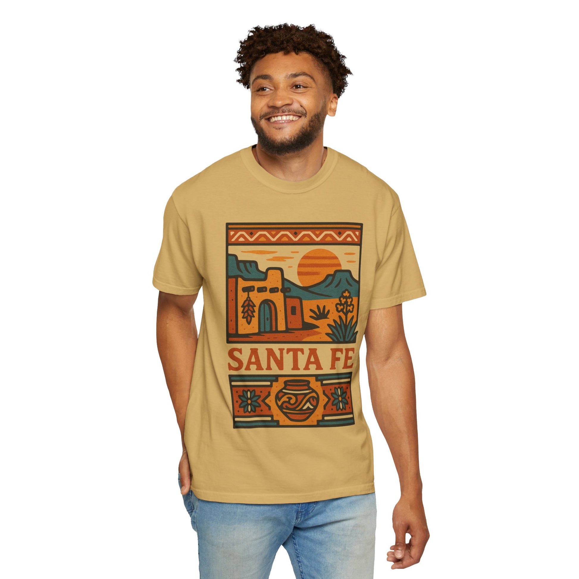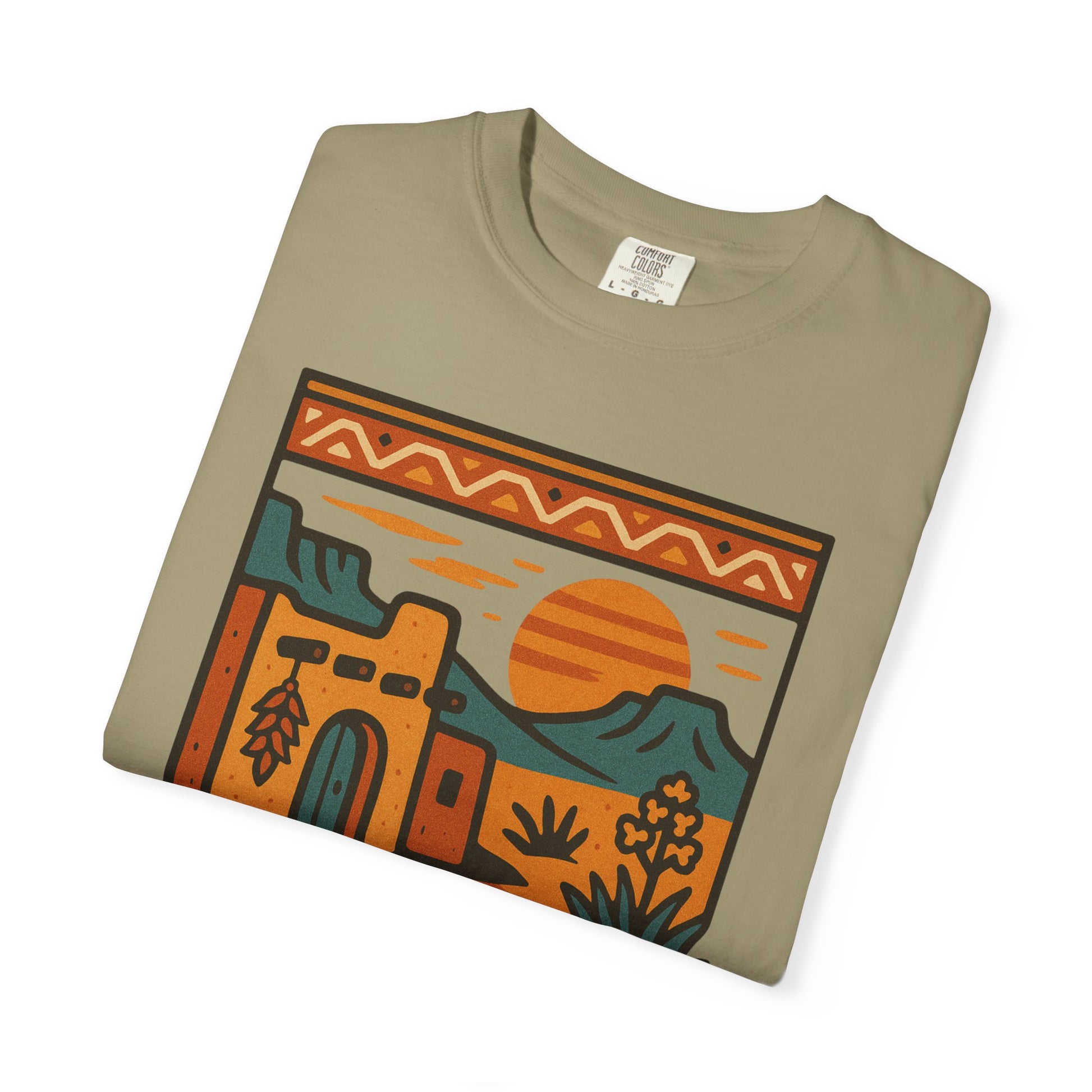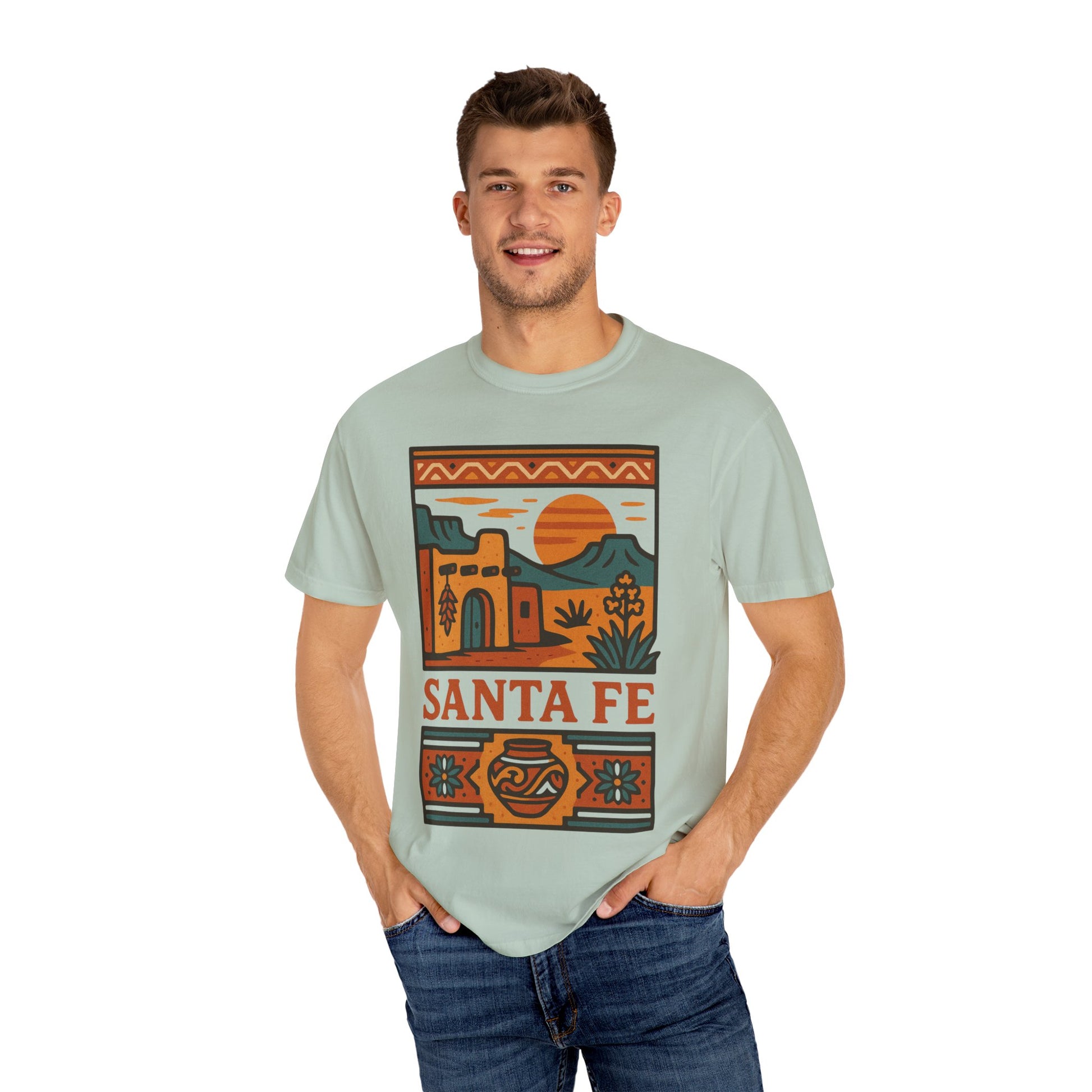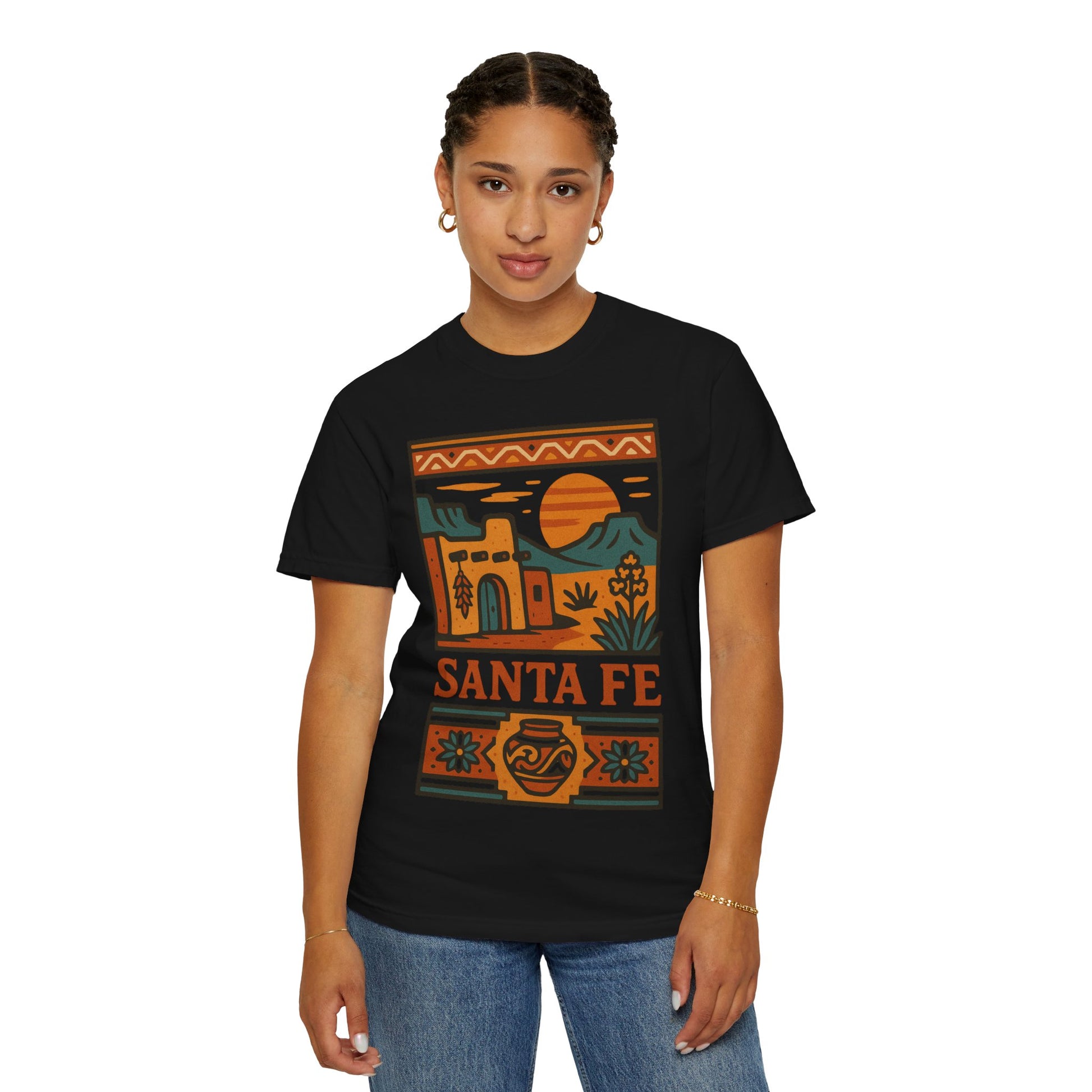 Bring Santa Fe's Desert and Mountain Landscapes and Southwest Culture alive with this Artdeco style T-shirt. Perfect for those who appreciate Southwestern aesthetics and want to add a touch of art to their wardrobe. Ideal for holidays like Cinco de Mayo and Dia de los Muertos.
