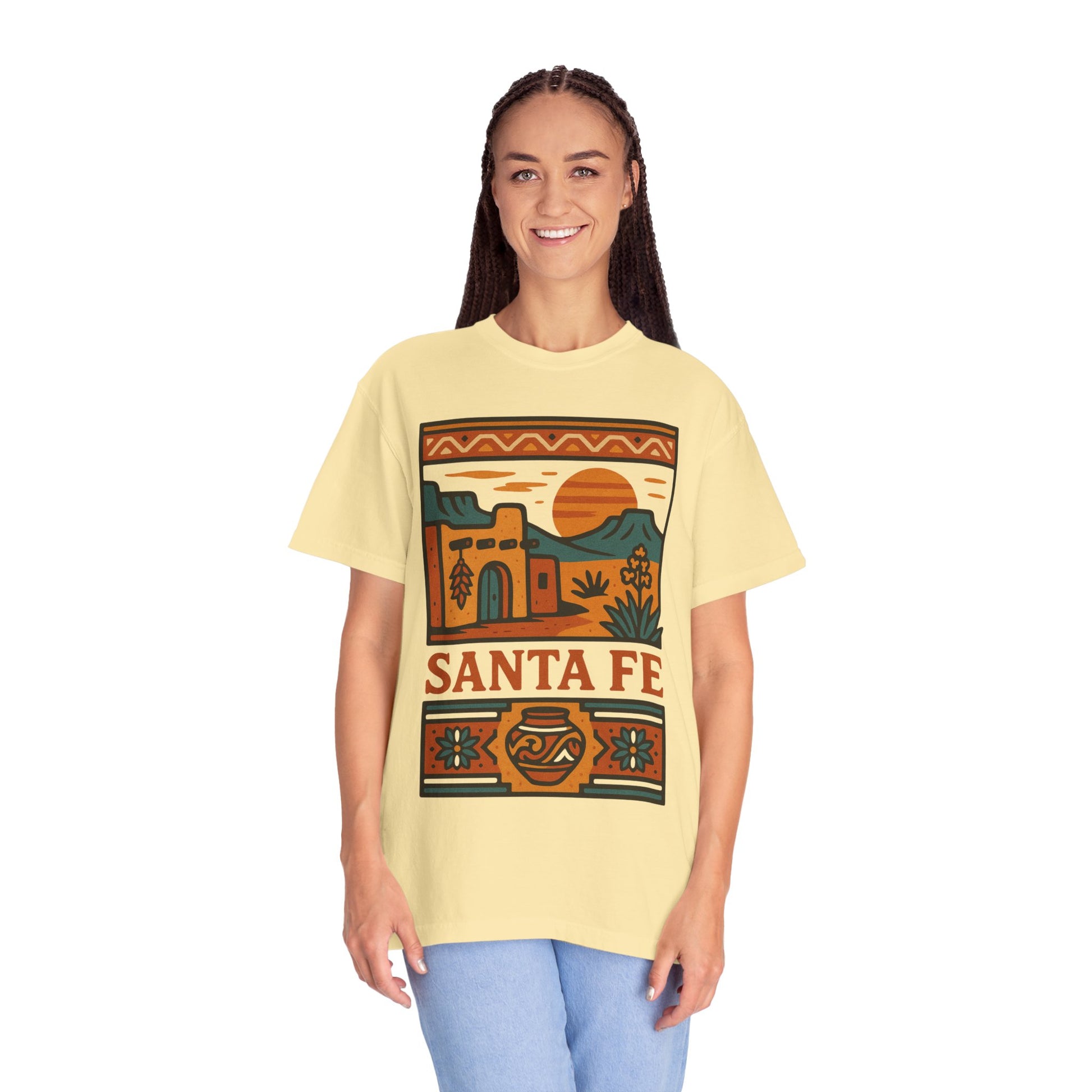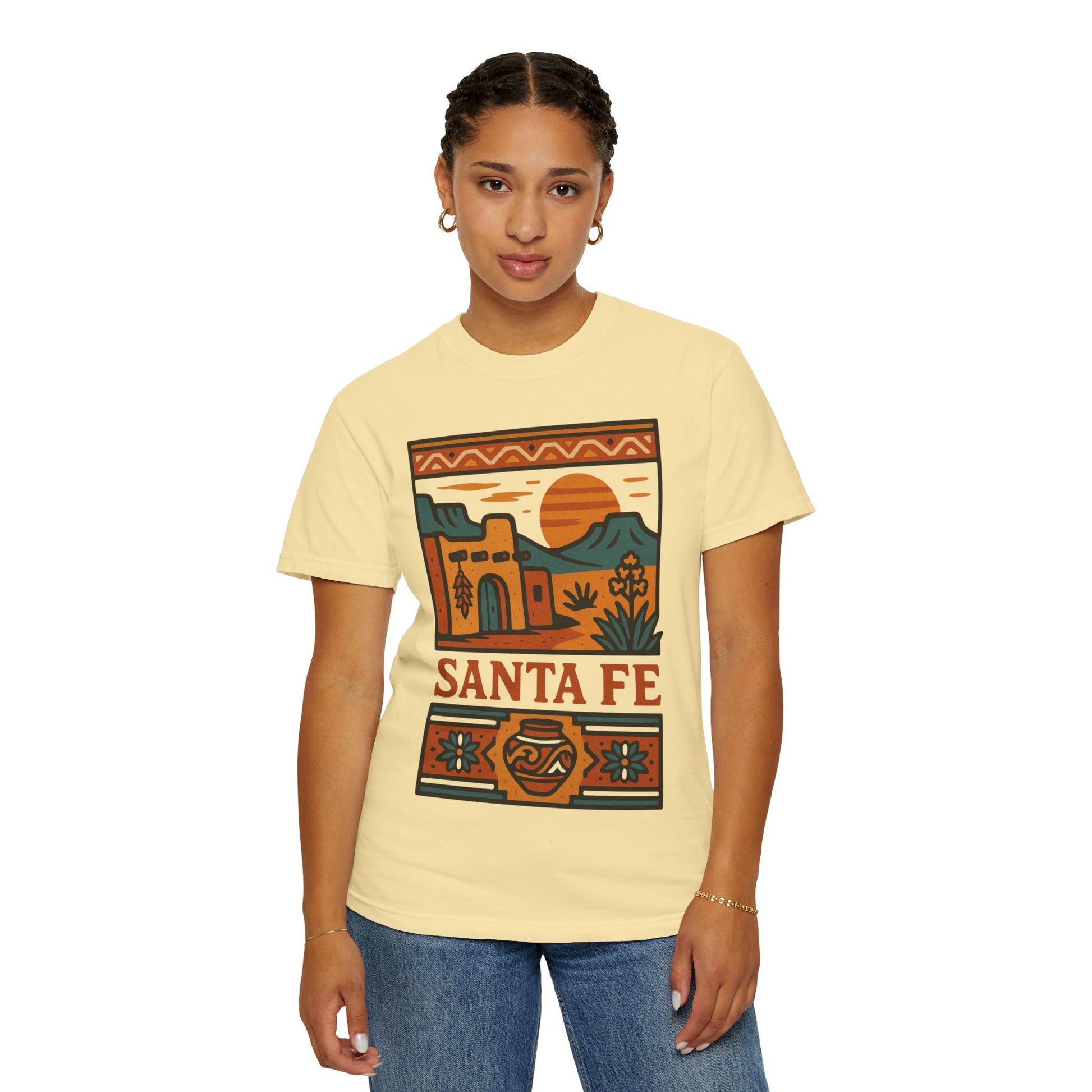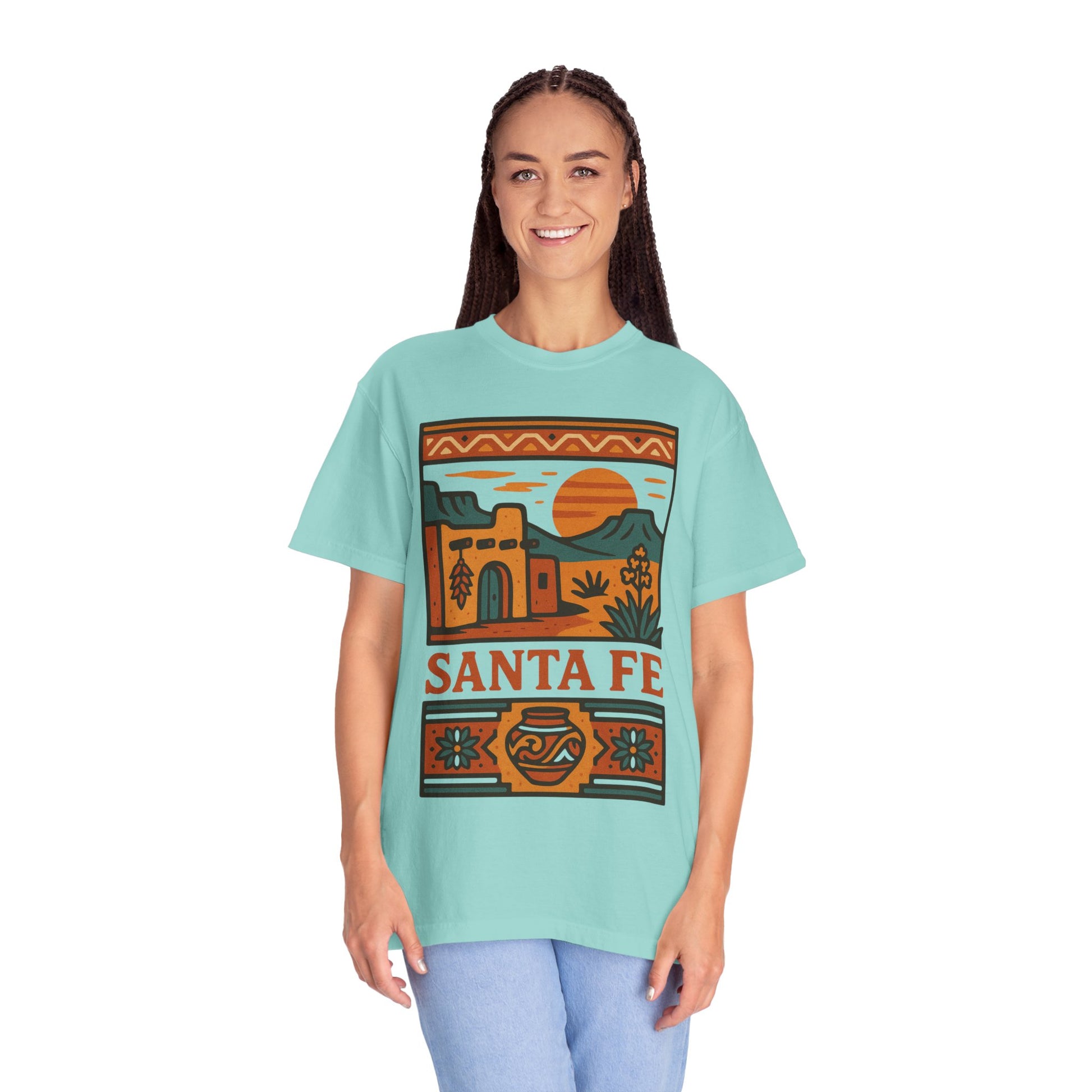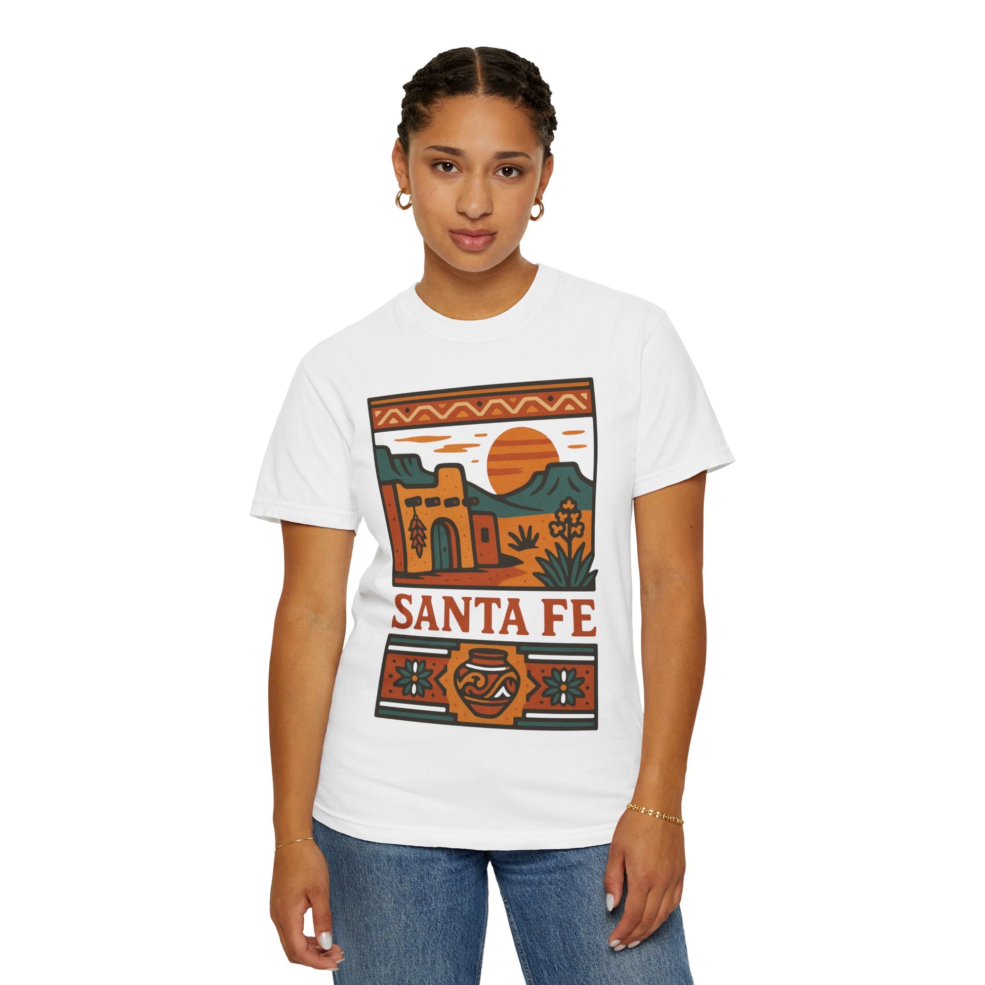 Bring Santa Fe's Desert and Mountain Landscapes and Southwest Culture alive with this Artdeco style T-shirt. Perfect for those who appreciate Southwestern aesthetics and want to add a touch of art to their wardrobe. Ideal for holidays like Cinco de Mayo and Dia de los Muertos.