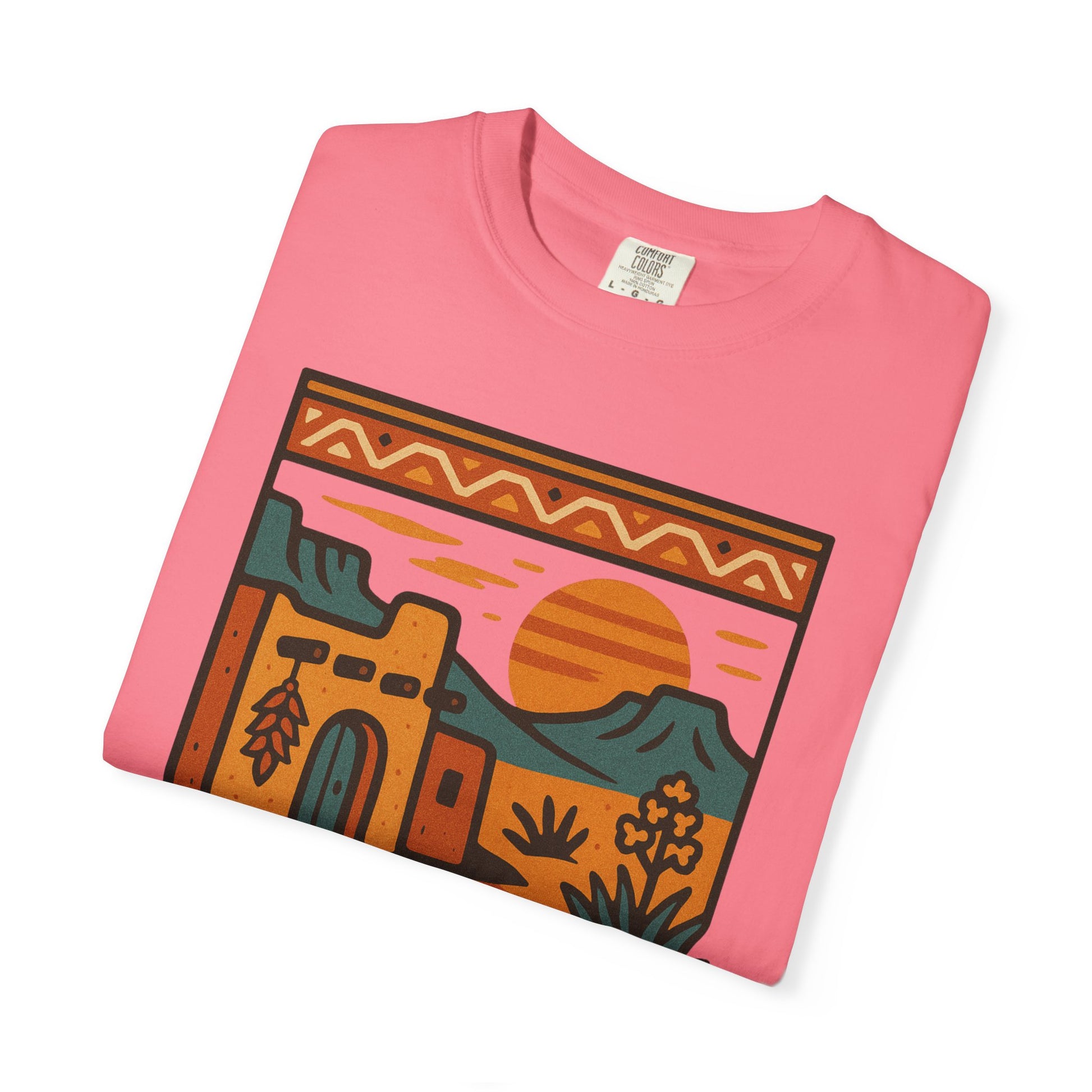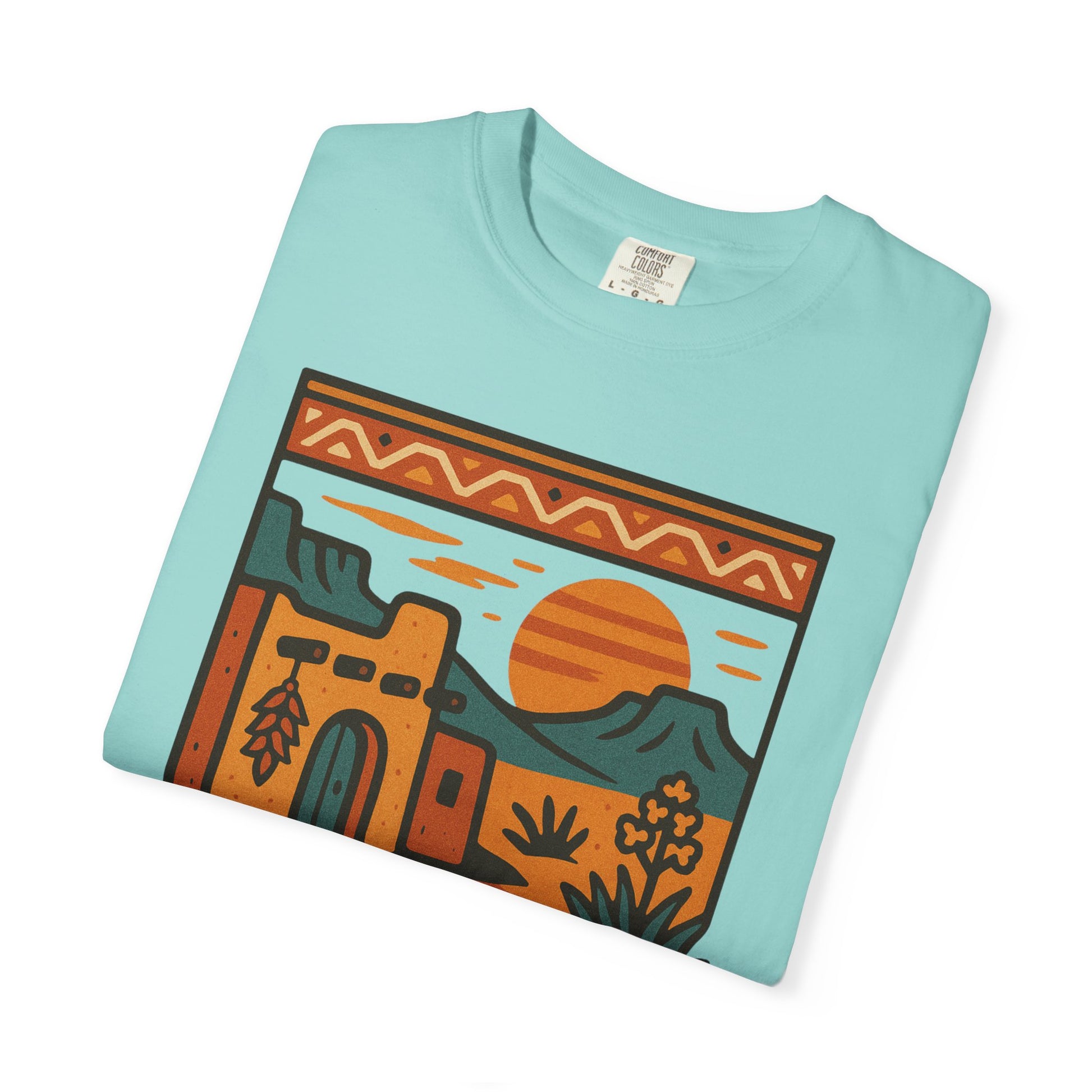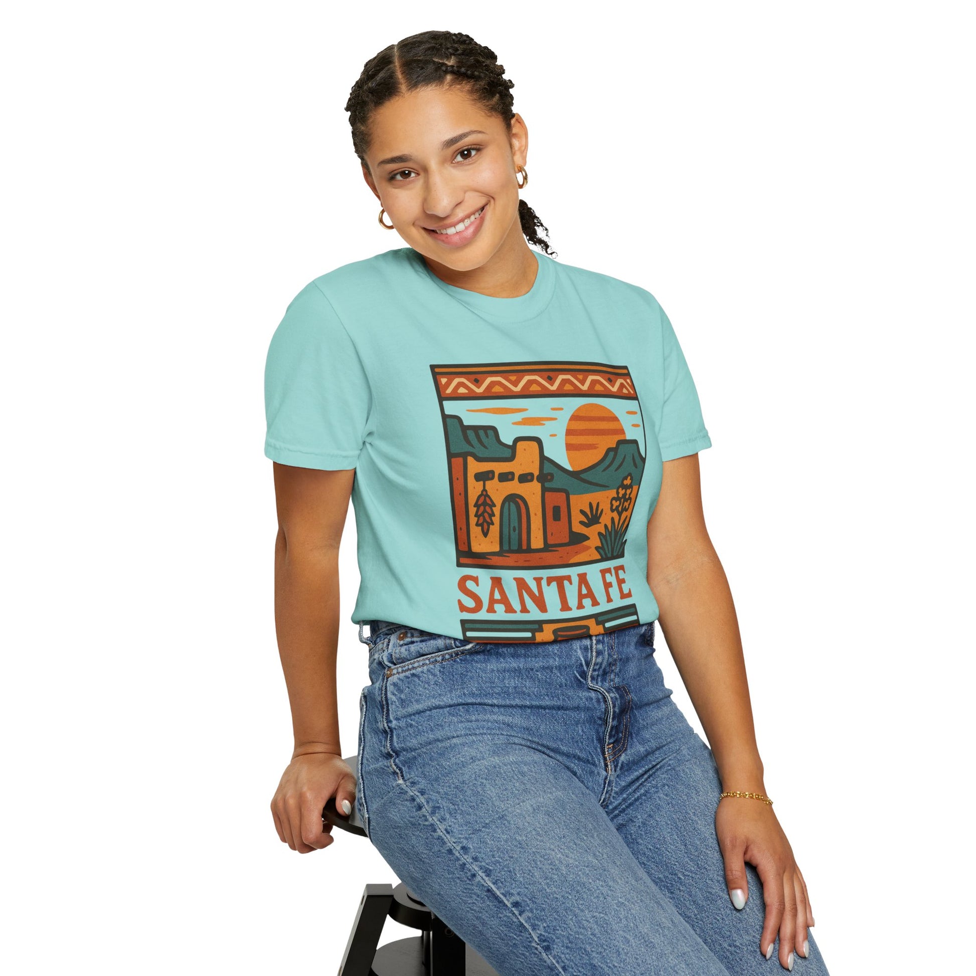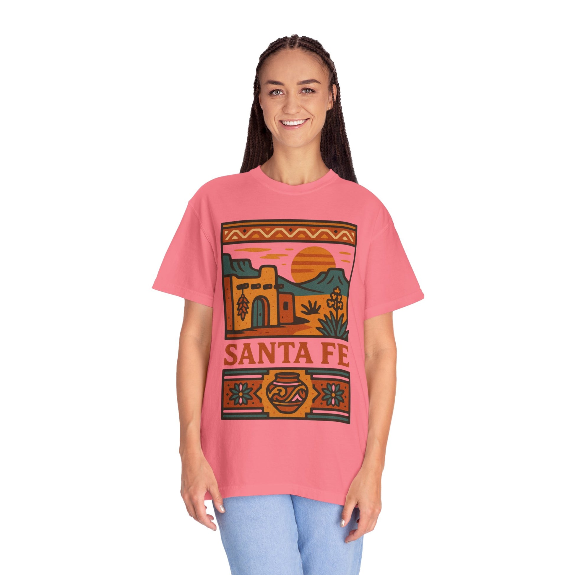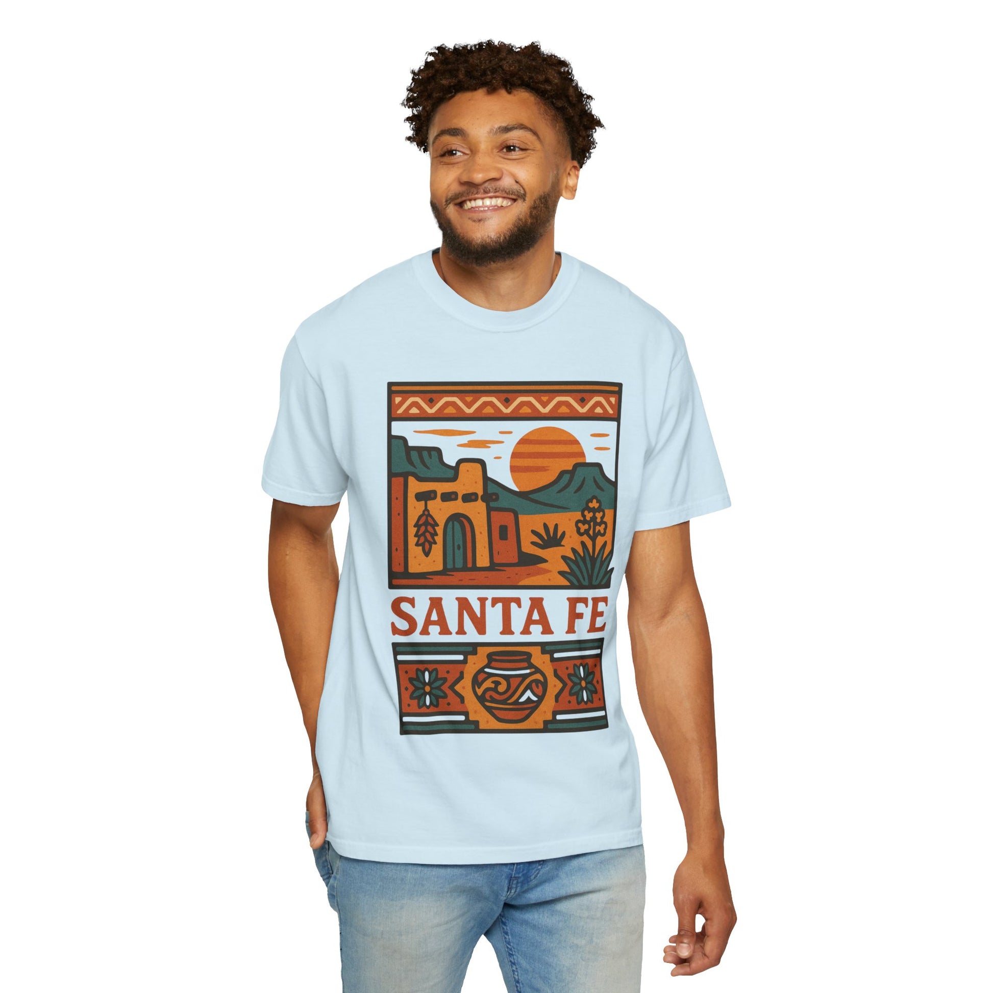 Bring Santa Fe's Desert and Mountain Landscapes and Southwest Culture alive with this Artdeco style T-shirt. Perfect for those who appreciate Southwestern aesthetics and want to add a touch of art to their wardrobe. Ideal for holidays like Cinco de Mayo and Dia de los Muertos.