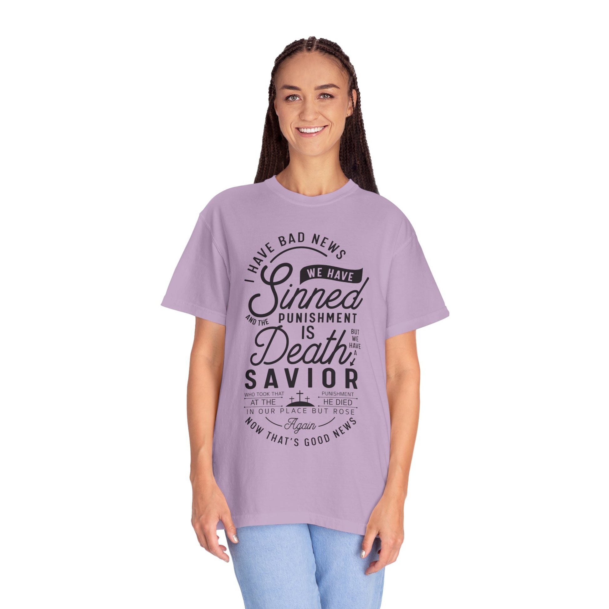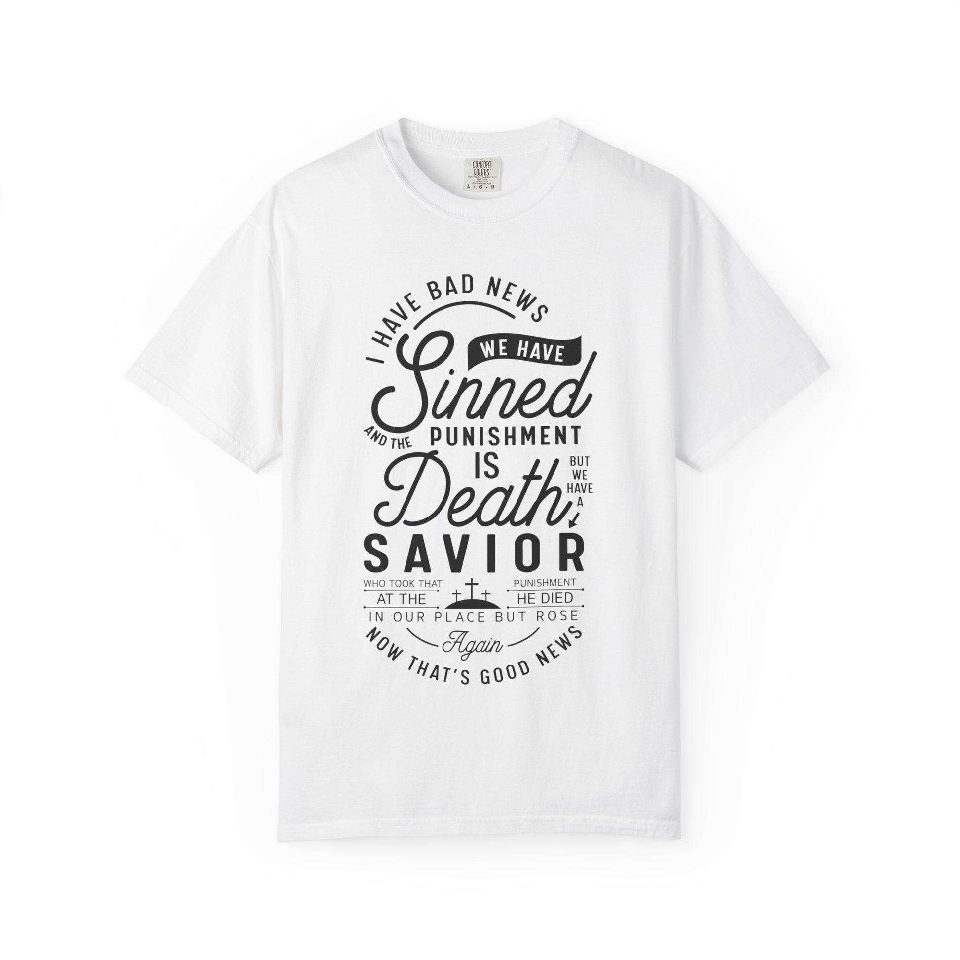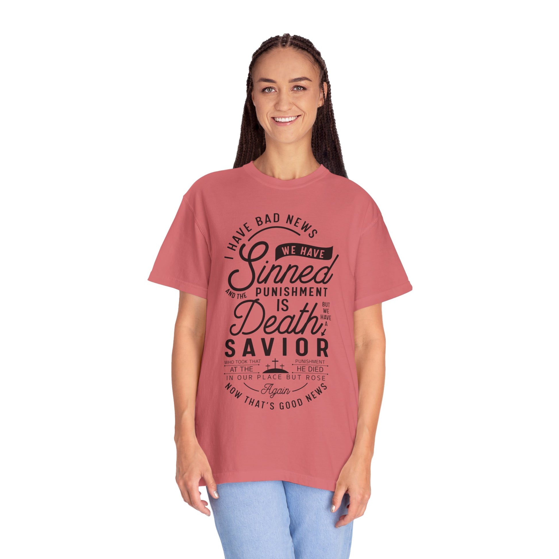An inspirational faith T-shirt with the design 'We have Sinned'. This garment-dyed unisex t-shirt is made with high-quality, 100% ring-spun US cotton for long-lasting comfort. The double-needle stitching and seamless design make it durable and attractive. Perfect for adults looking for a comfortable and stylish tee with a message of faith.