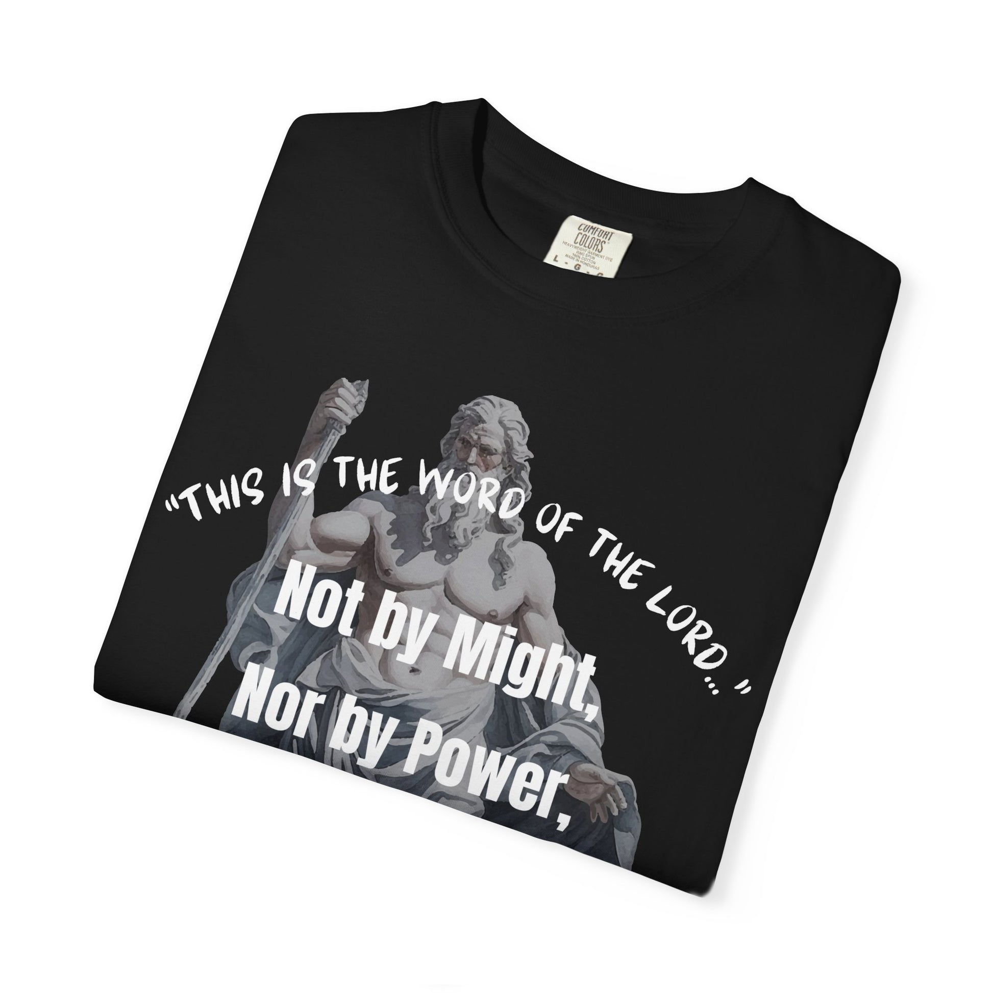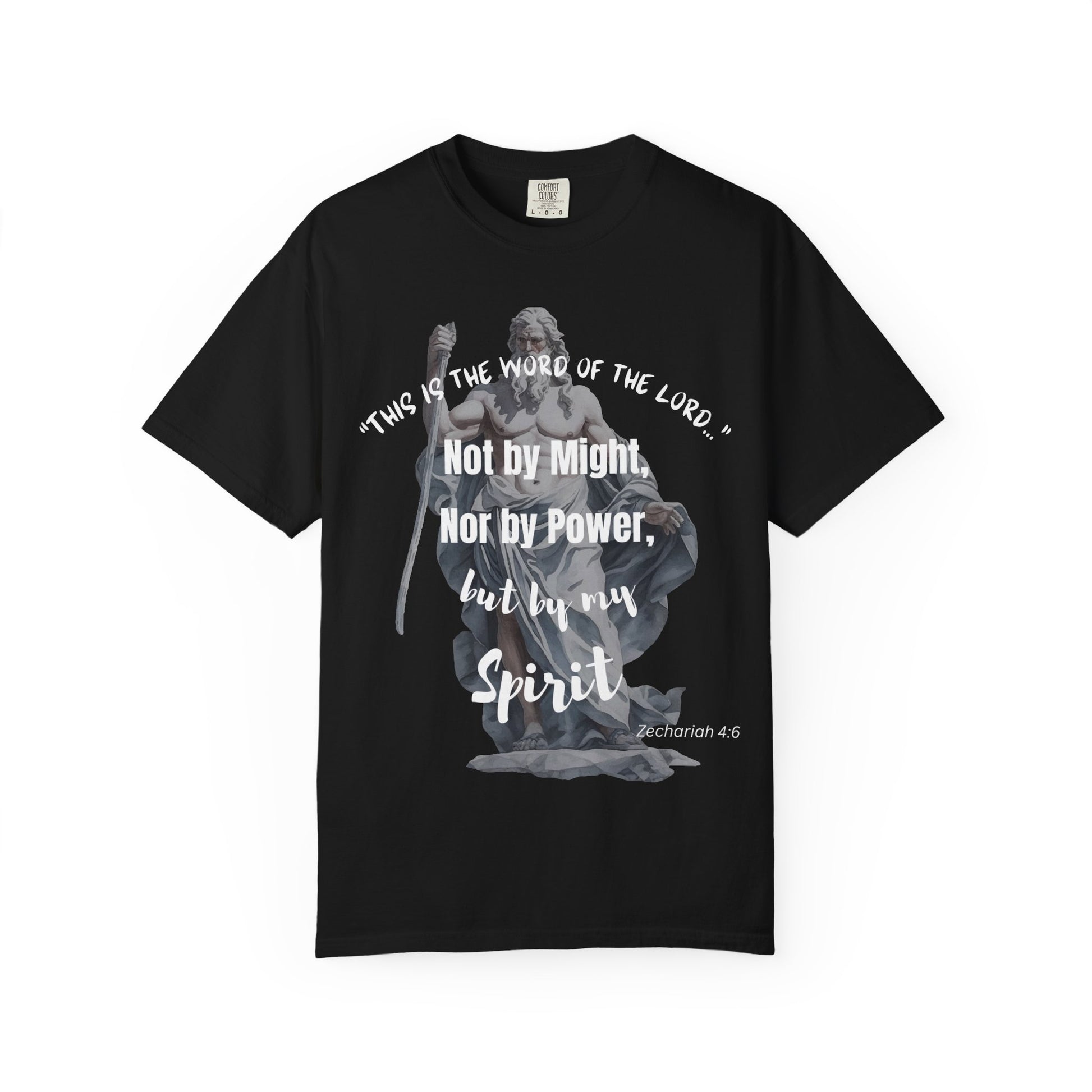 An inspirational scripture T-shirt featuring the quote 'This is the word of the Lord, Not by Might, but by Spirit'. This comfortable garment-dyed T-shirt is made with high-quality 100% ring-spun US cotton, making it perfect for adding a touch of inspiration to your everyday wardrobe. Ideal for adults who appreciate faith-based clothing. Perfect for religious holidays and events.